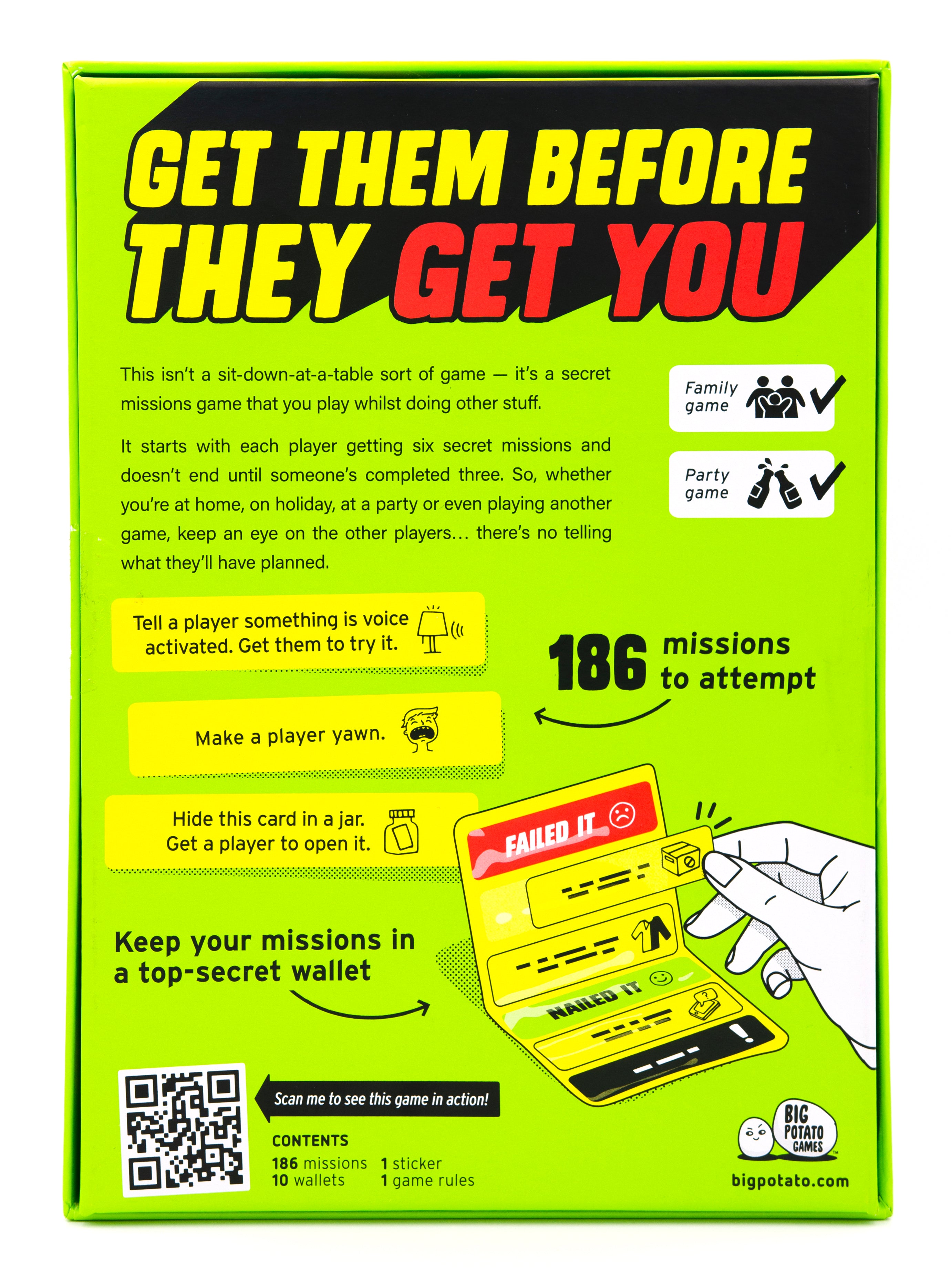 SIX SECRET MISSIONS: In this party game, each player starts with six missions to complete.